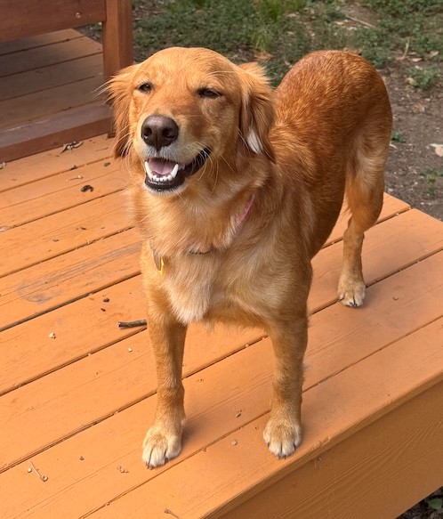 Like many Goldens, she startles at new or unusual noises, but she quickly looks to her people for reassurance. What she needs most is someone to show her that the world is safe, and that love is hers to keep.