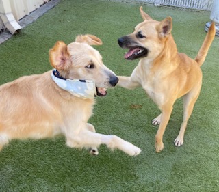 Yogi recently met a doggy friend and had an absolute blast playing until their tongues were hanging out. He’s still a little unsure about new dog introductions, so slow and positive experiences are key to helping him build confidence.